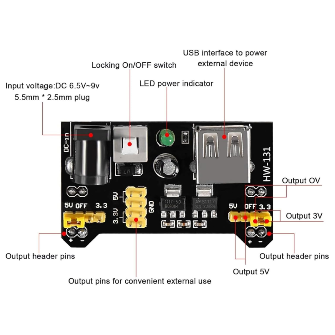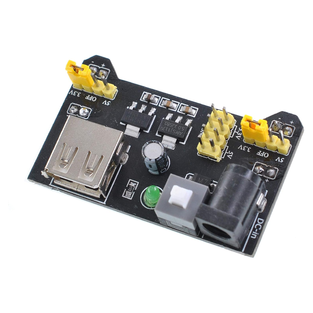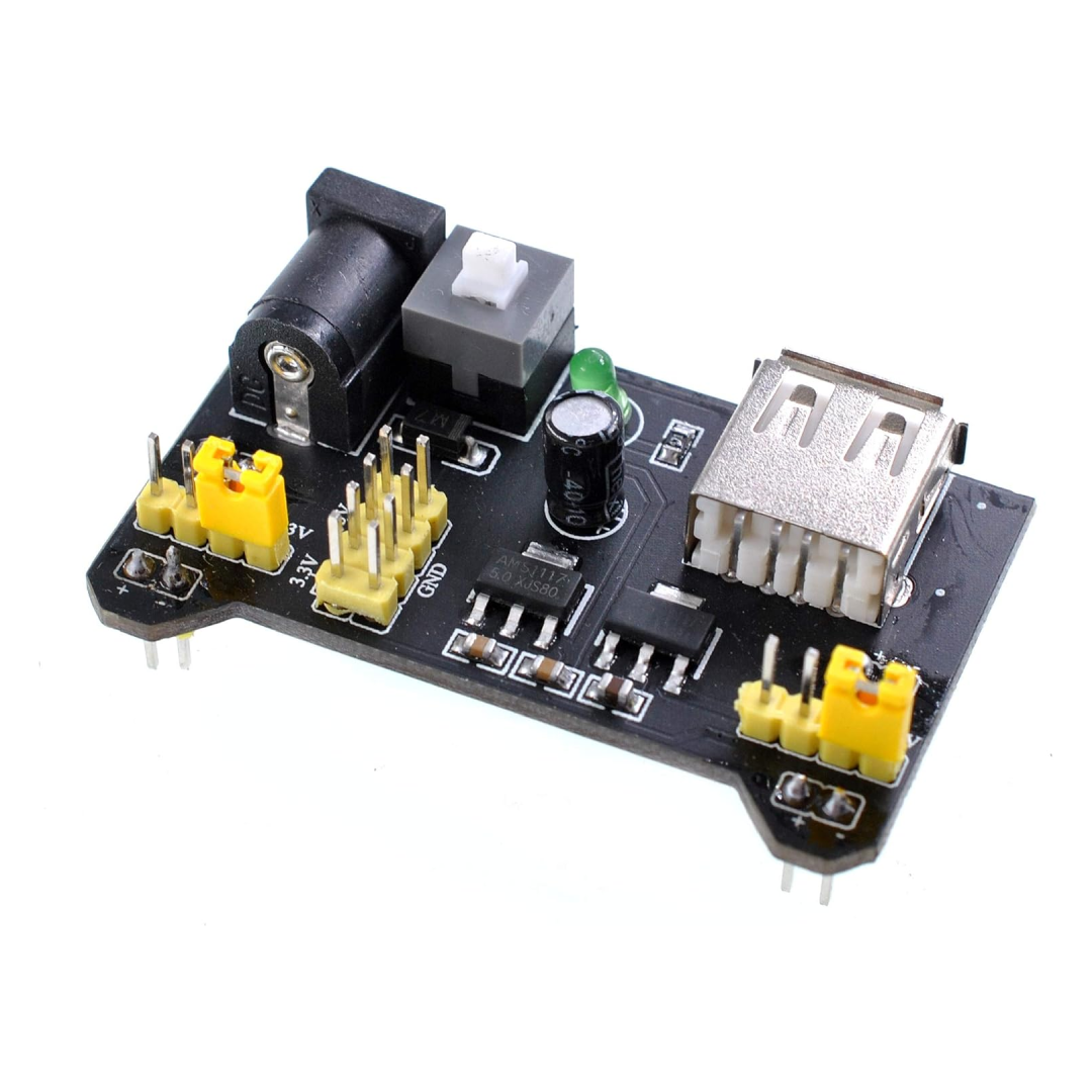 Encaja perfectamente en la protoboard MB-102 dándole alimentación a los dos buses laterales.